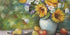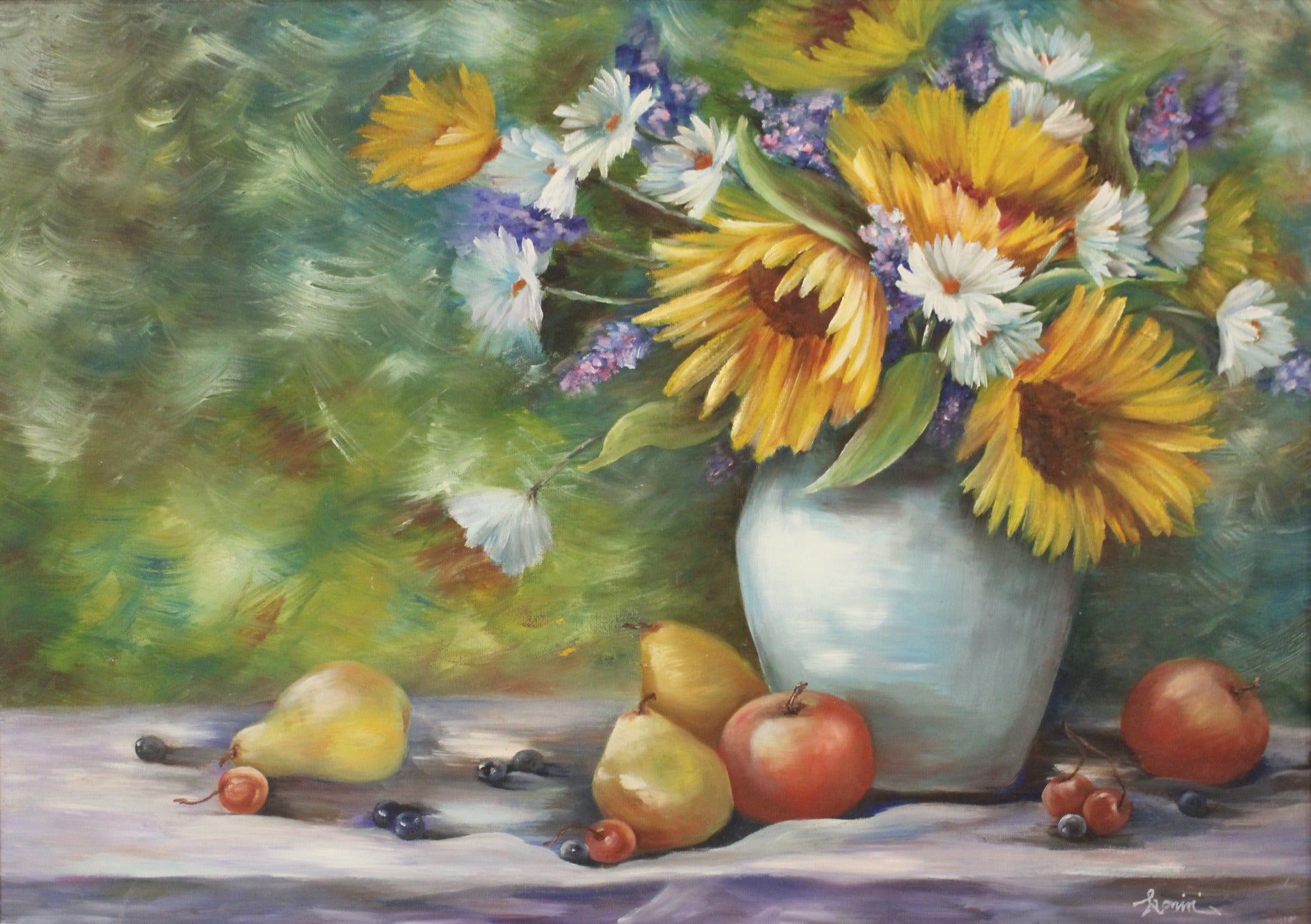 A combination of bright sunflowers, sweet daisies, and elegant lavender blooms sit on a table, lined with silk and scattered with fruits.