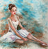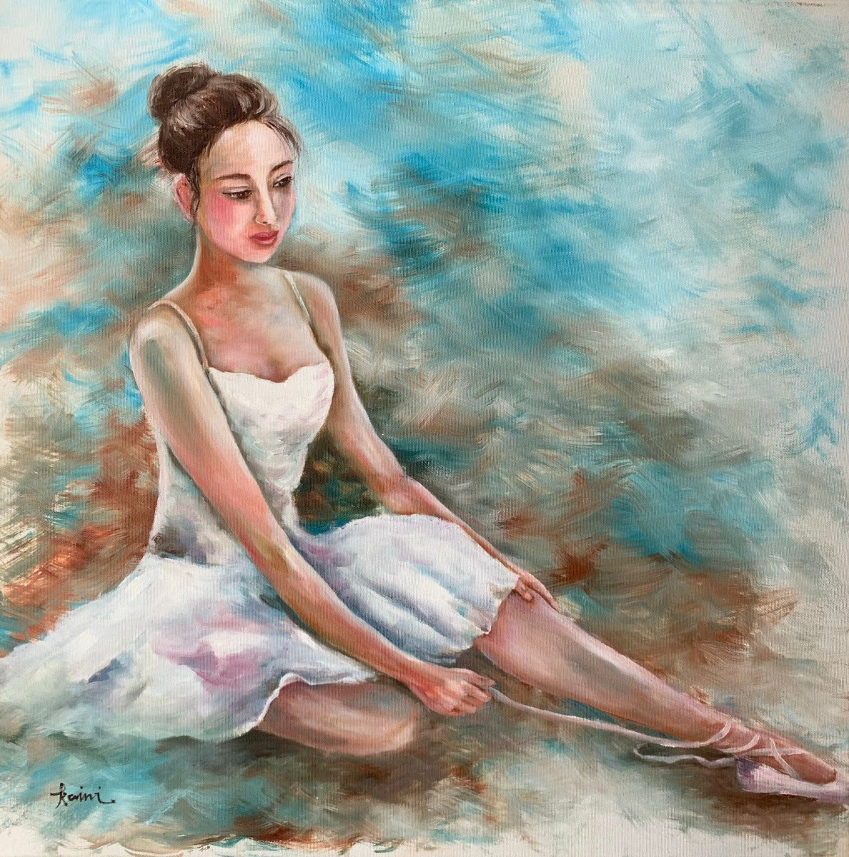 The oil painting portrays a ballerina seated on the floor with her legs extended, wearing a delicate white tutu and pointe shoes. Her graceful posture and serene expression convey a sense of poise and elegance. The painting is a beautiful tribute to the art of ballet, capturing the beauty and grace of a ballerina in a quiet, introspective moment. The artist has used colour, detail and light to create a captivating and memorable work of art.