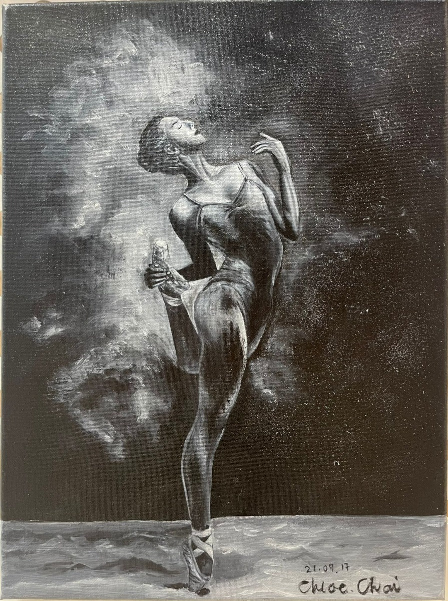 Dancing In Your Dream depicts a dancer gracefully gliding across the stage, their movements perfectly in sync as they perform a series of elegant lifts and turns, moving with such grace and elegance, it's almost as if the dancer is floating in the air. The use of powder adds an extra element of creativity and artistry to the performance as the dancers use it to create stunning visual effects. The monochromatic colour in this painting brings out the mood on stage, the powder seems to fall like snow as they move, creating a sense of lightness and ethereal beauty. The background of the painting is filled with swirling clouds and a soft, hazy glow, adding to the dream-like quality of the scene. Overall, the painting captures the beauty and elegance of ballet, and serves as a tribute to the art form.