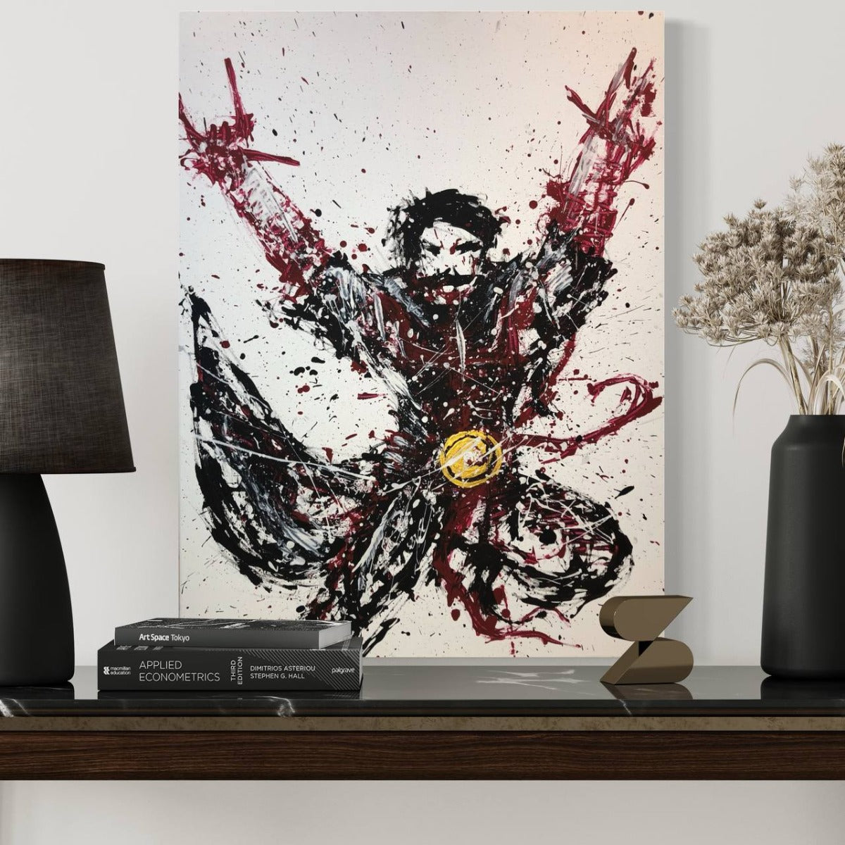 Description: Part of my Marvel Heroes Tribute series, this is one of my most personal artworks showcasing to a great extent the skill and art of painting only with drumsticks. As the creator and founder of the ‘Playnting’ technique and philosophy of visualising rhythm of internal self and external world, many have likened me to a wizard or a sorcerer who transforms music into visual art. With metal and rock as my go-to genre of music, I resonate with the hard hitting drum beats and aggressive guitar rifts to my own temperament which I eloquently transferred to the canvas with only drumsticks and paint. You may take this as a self-portrait of myself as I see myself as Doctor Strange and use my art form as a cathartic release to purify my anger and frustrations into an iconic symbol known to many as one who protects the world from evil and demonic forces - just as how I protect myself from my own evil and demons through my innovative art form. May this piece be a reminder for you that even you have the power to be your own sorcerer. To empower you to seize control over your negativity and transform it into positivity. To be your own solution to your own ailments. With me rocking out to you. That’s so metal bro.