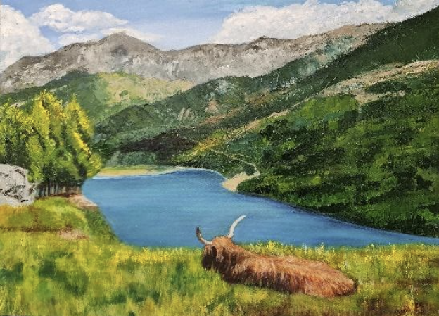 Picture taken in the highlands of Scotland. A highland cow overlooking the lake and appears to be reflecting suggests that we should always take some time to sit, admire nature and reflect on ourselves.