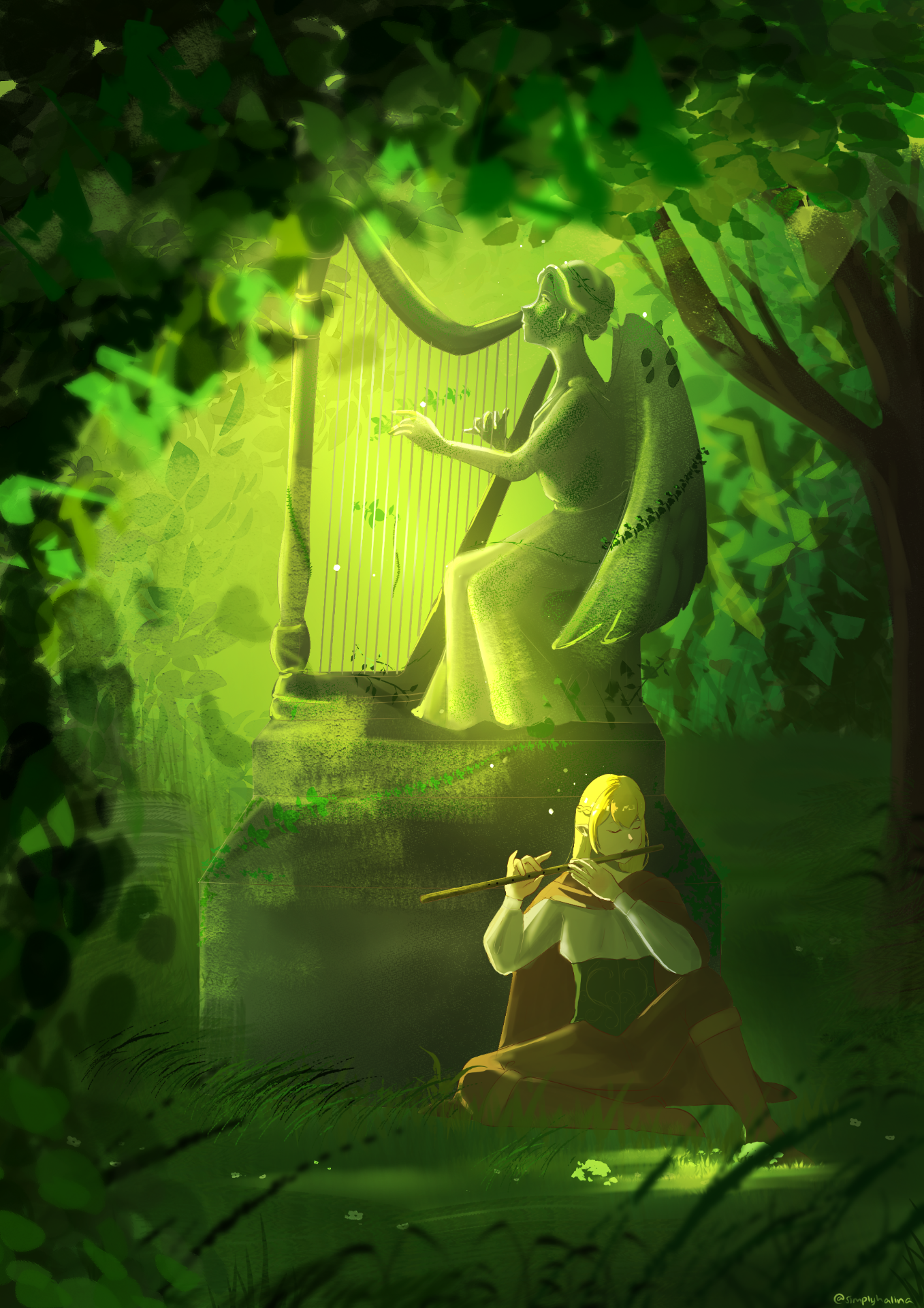The artist illustrates two wandering musicians—an elf and an angel—who once traveled and played music together. After the angel’s passing, a statue was erected in her honor. The immortal elf, still bound by the memories they shared, returns each year to play her flute beside the statue, keeping their duets alive through time. The artist captures this act of remembrance as a quiet, emotional tribute to their enduring bond.