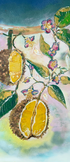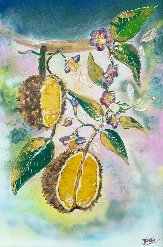 Durians are commonly associated with South East Asian cuisine, especially in Indonesia, Malaysia, Singapore, Thailand, Cambodia, Philippines and Vietnam. Whilst only one kind is sold internationally, there are many species of the Durian tree consumed around various producing regions, and they can have different taste. Durian lovers will report flavours of cheese, almonds, garlic, caramel, sometimes all at once!!! With these particulars and its unique olfactive element, you probably don’t want to taste it. But as a local resident, most of my friends eat Durian, so I decided to give it a try. “First time, it was not so bad lah”, surprisingly not disgusted, except for the long lasting bitter taste. The second time, I was invited to a wonderful Durian tasting by my friends. There were 3 different types ; bitter, creamy, and sweet. Savouring Durian suddenly felt like a celebration, I enjoyed the full degustation, and felt blessed to have been served this delectable fruit. I did come out with a favourite which was the creamy one. So when I created my Artwork “Durian”, I vouched for the texture of the fruit using relief painting, and elected golden leaves to portray the fruit’s powerful taste. The flower brings sweetness and glamour, as I like to boast the notoriety of the fruit and all the folktale around it.