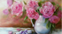 Luscious pink peonies, accompanied by the subtle baby’s breath, sit in a porcelain jug on a silk-lined table. This piece exudes elegance and beauty, showcasing the intricately-painted peonies in full bloom.