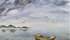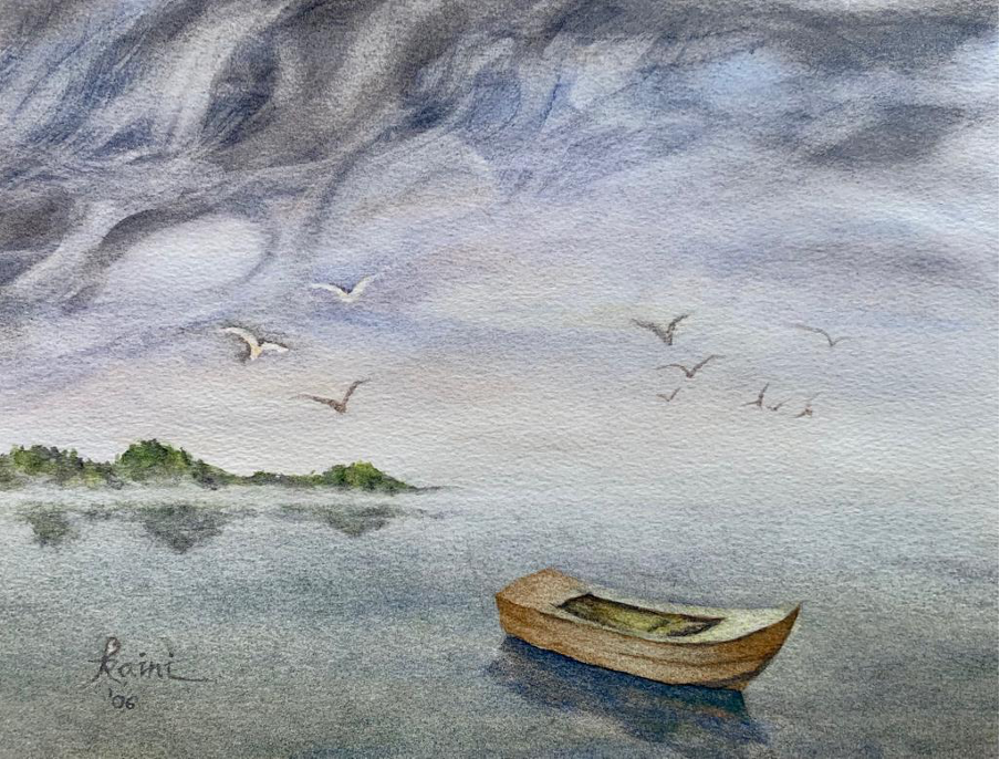 A lone row boat floats along on the peaceful, still waters. Contrastingly, the gloomy sky is painted with much movement, with brushstrokes going in different directions and hues of grey and blue mixing with one another.