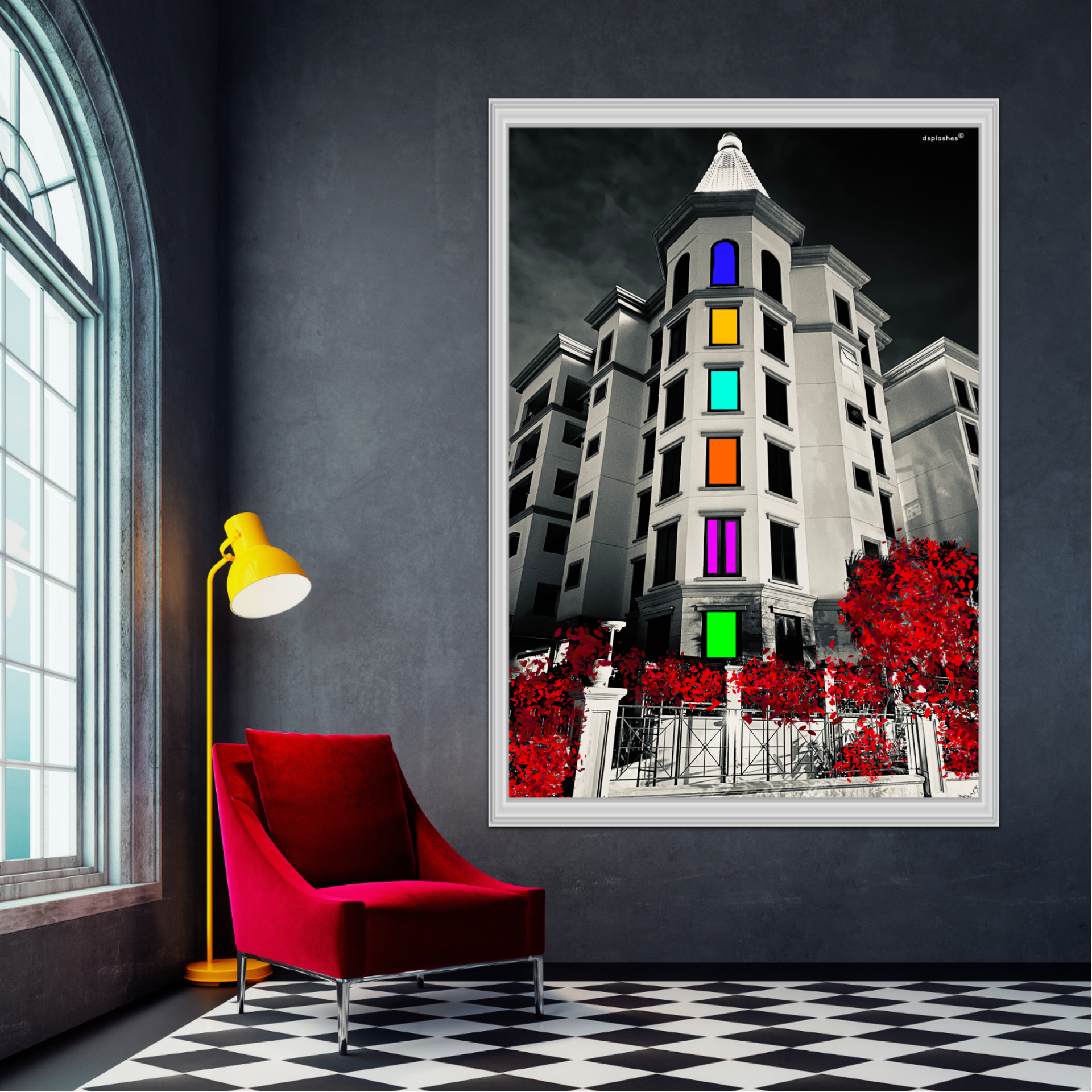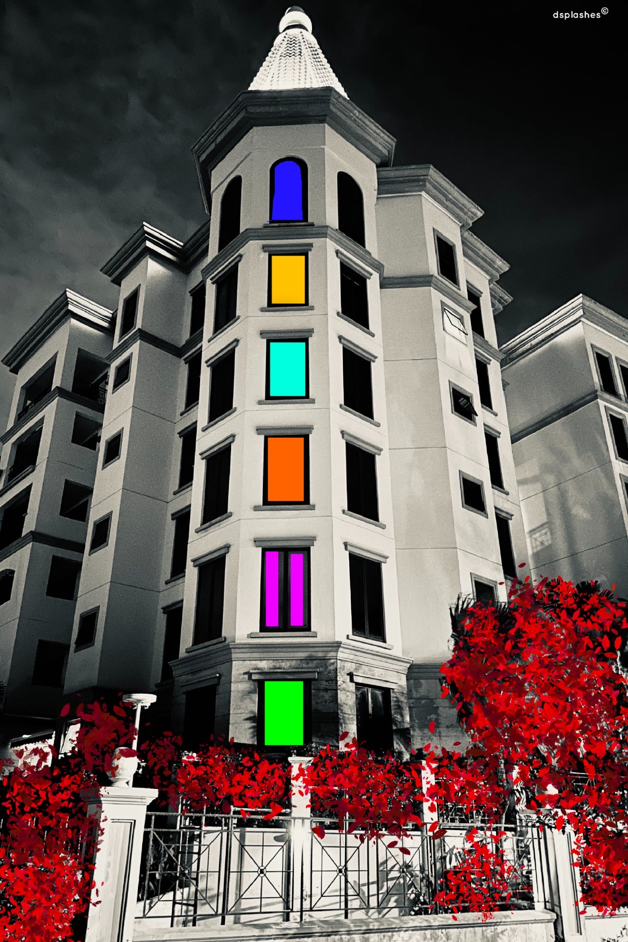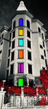 Inspired from the neighbourhood, a photo captured and transformed into this beautiful night seen art. This is a residential building surrounded by nature . These colorful windows just stand by right against the night scene inspiring to see the colors in black and white life.