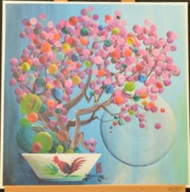 “The rooster bowl” evokes memories of the artist's past - memories he wishes to leave behind. Yet, through the colourful depiction of a bonsai tree with leaves in the form of bubbles reflects his hopes and desire for a vibrant future, filled with growth and renewal.