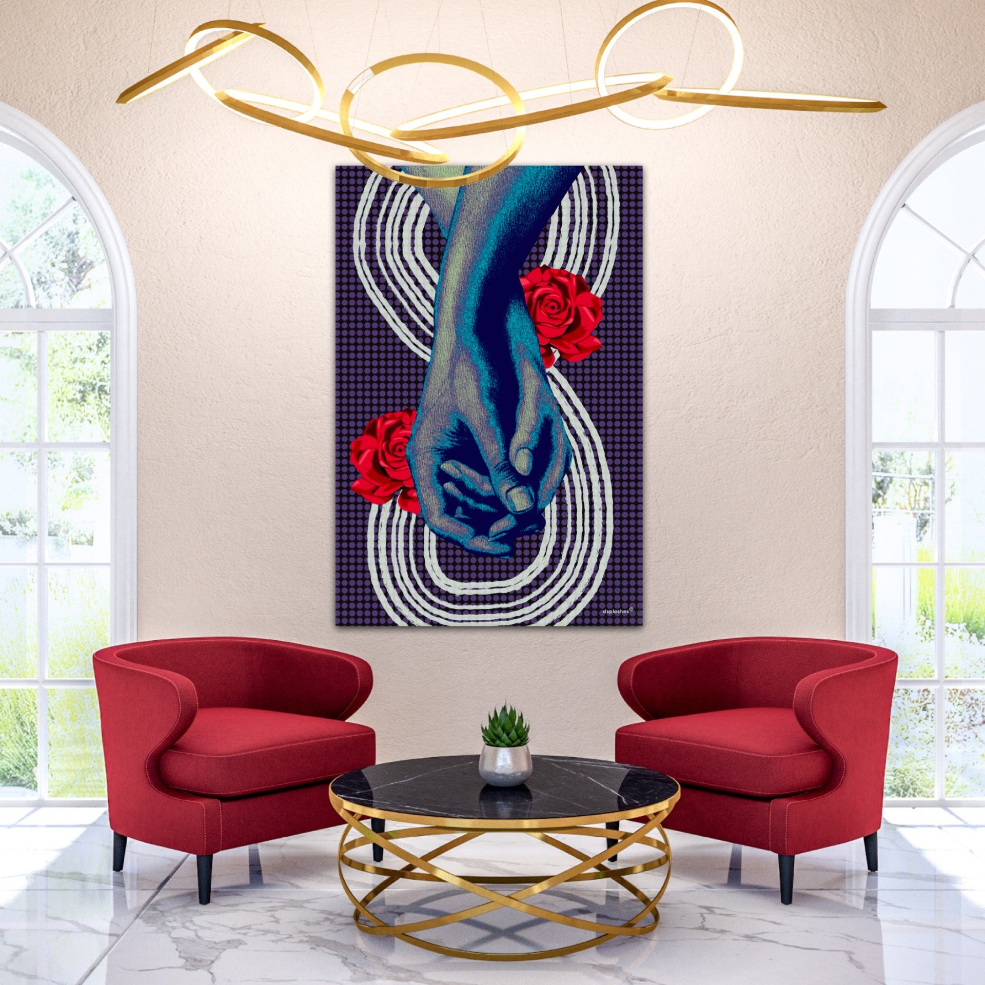 Love, captured in a handhold. This artwork rendered on a large canvas showing a couple holding hands. The vibrant colors used in here symbolises the strength and love. The firmness of hands holding depicts their commitment and attraction to each other to live a promising and good life. They have found their way and ready for the new beginnings.