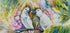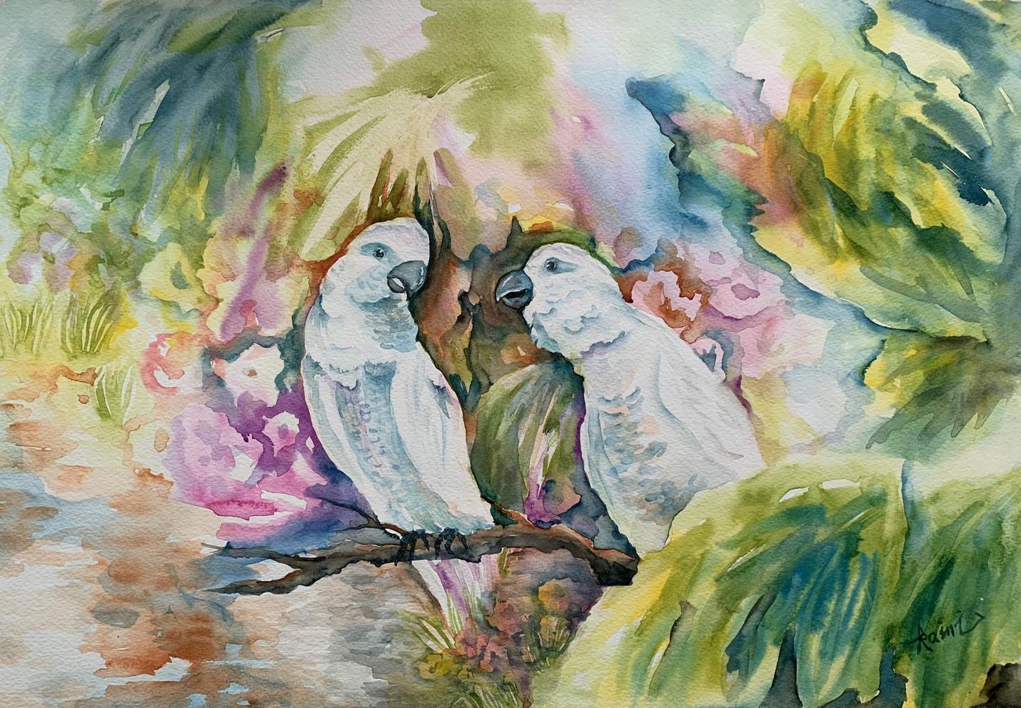 Sharing a branch, two parrots look as if they are whispering to each other, having a conversation in their own little world. The background is painted in a blur of colour and shapes surrounding them, creating contrast with the brighter and sharper illustration of the two birds.